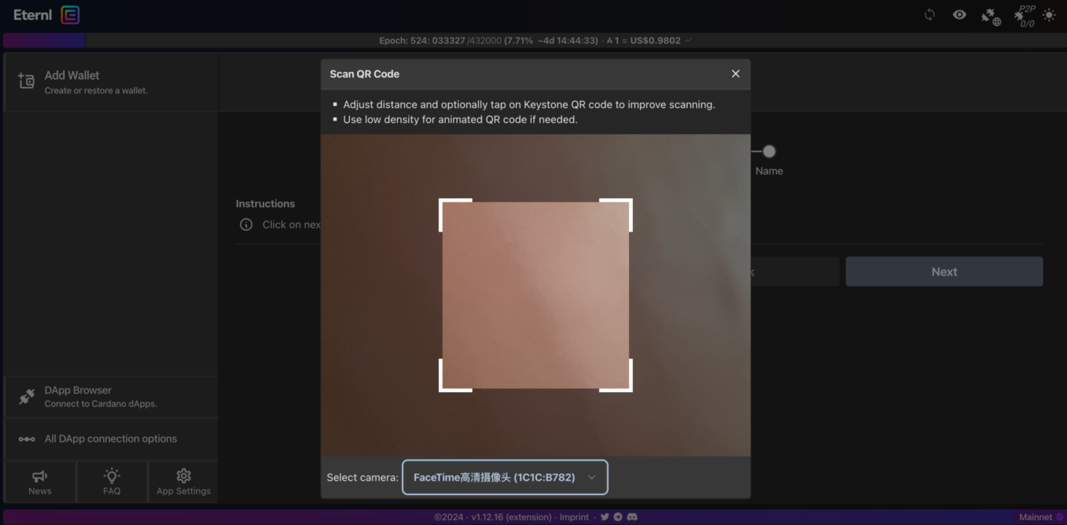 点击 [Next],使用您计算机的摄像头扫描 Keystone 生成的二维码;