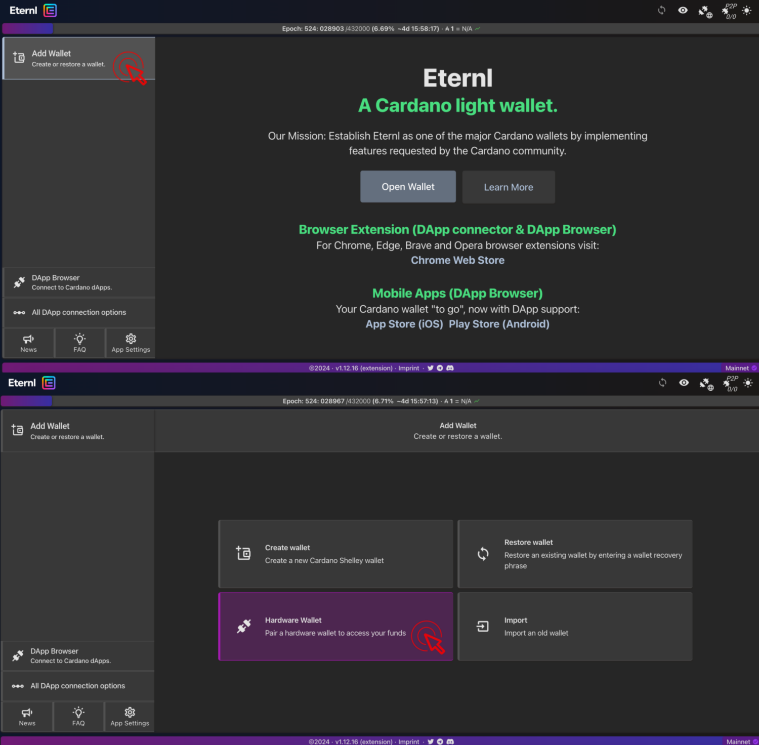 在 Eternl 网页上,依次点击 [Add Wallet] > [Hardware Wallet]