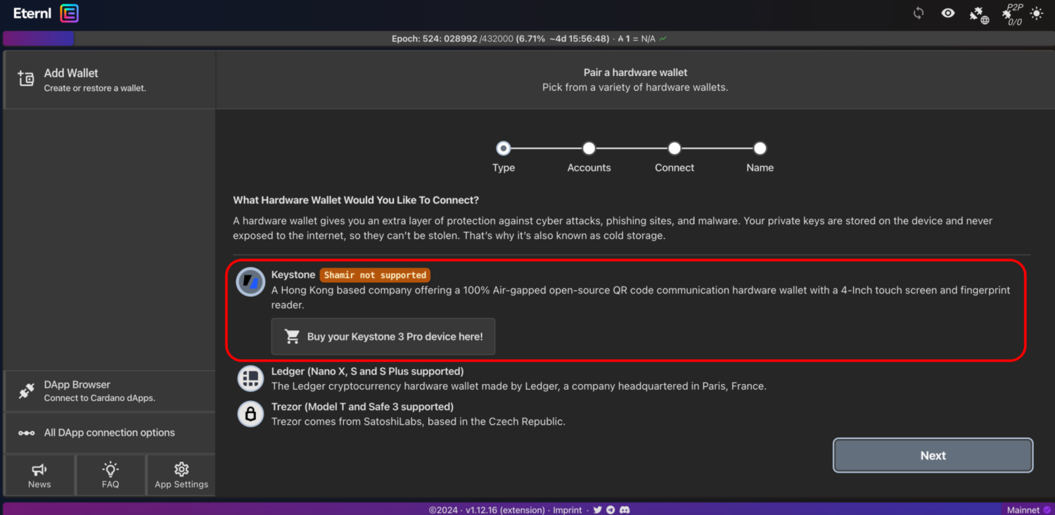 本教程将指导您如何使用 Eternl 网页端和 Keystone 硬件钱包配合管理您的 Cardano(ADA) 资产。