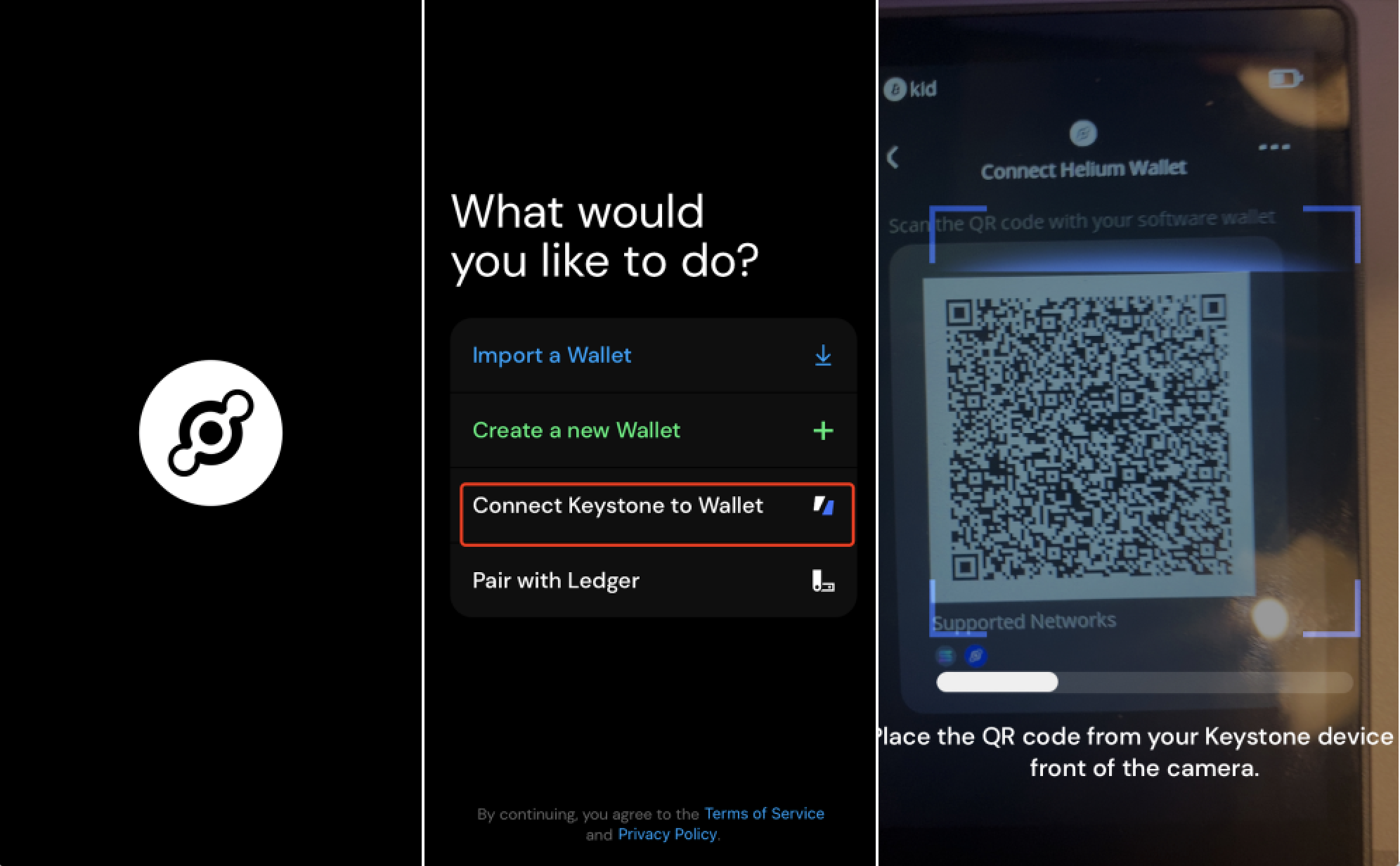 打开 Helium Wallet 应用,进入主页,点击 ”Connect Keystone to Wallet”,然后使用摄像头扫描 Keystone 生成的二维码。