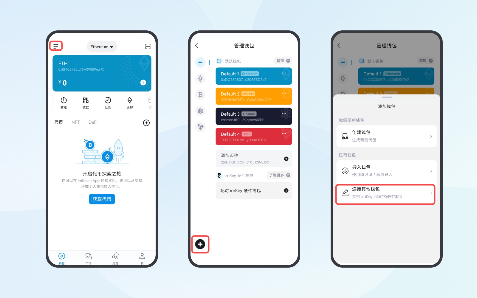 打开 imToken 并创建一个临时钱包以找到 [连接其它钱包]的入口。