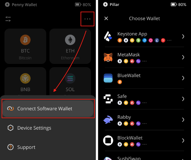 创建完临时钱包后,点击左上角的设置按钮 > [+] > [连接其它钱包] > [Keystone] > [扫码连接]。