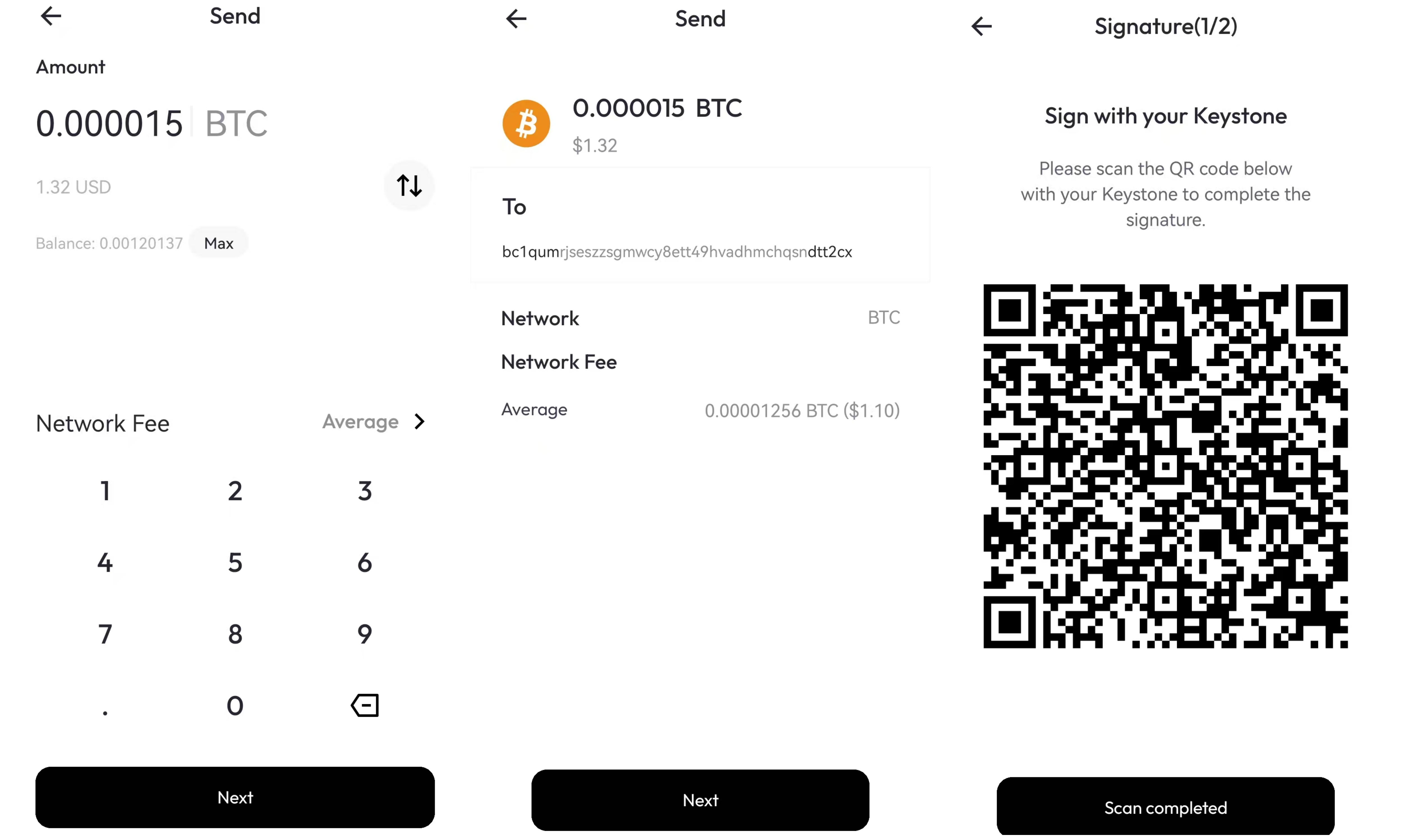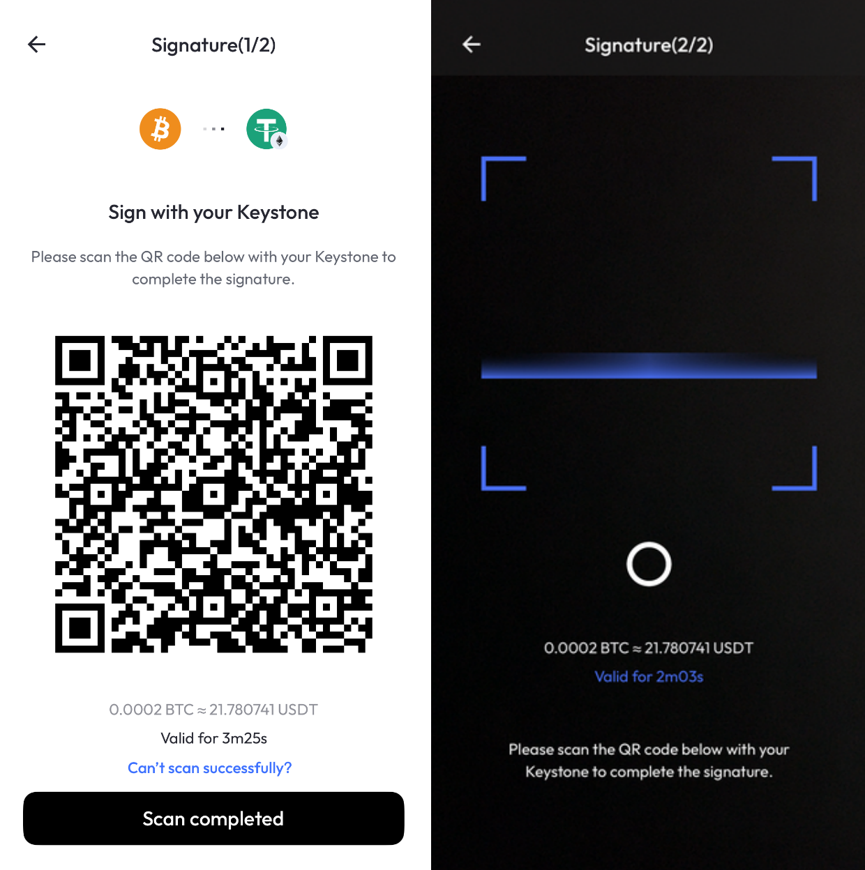 - 回到 Keystone Nexus,点击 ”Scan completed”,使用手机扫描 Keystone 页面生成的二维码,即可完成交易。