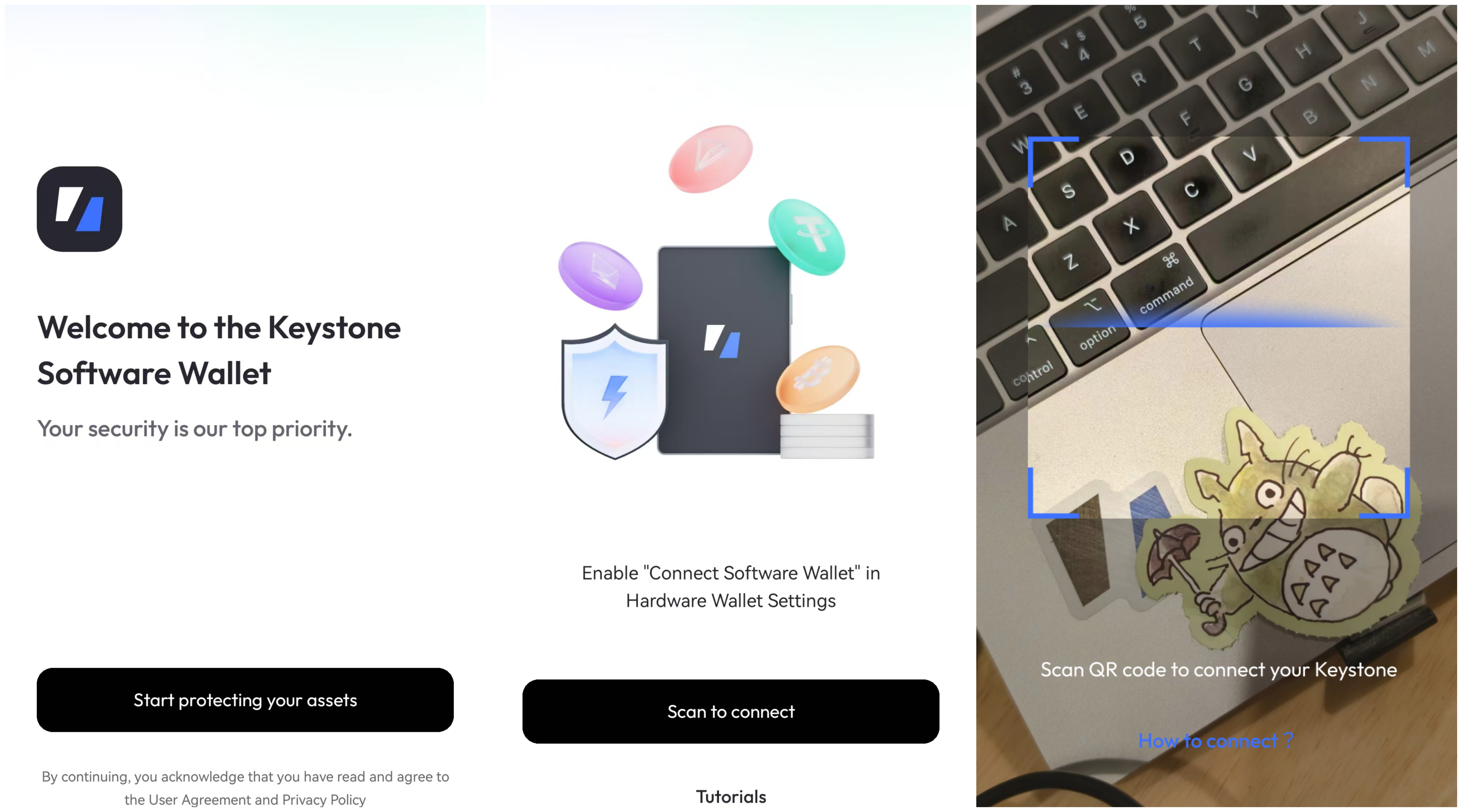 - 打开 Keystone Nexus 应用,进入主页,点击 ”Start protecting your assets”后选择“Scan to connect”,然后使用摄像头扫描硬件钱包上生成的二维码。