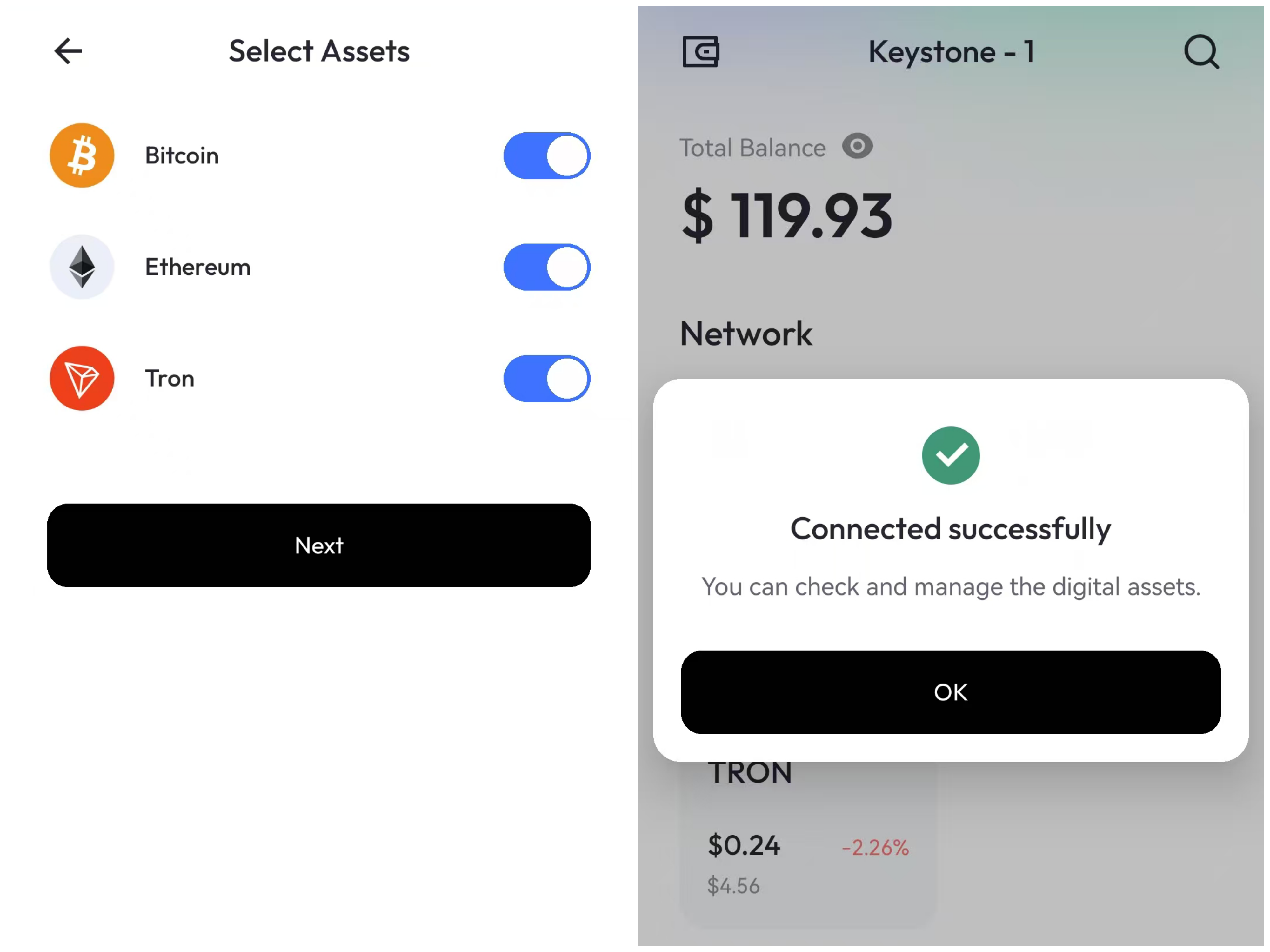 扫描完成后,选择您需要管理的币种,应用出现 “Connected successfully“ 的弹窗,意味着您成功绑定了您的 Keystone 硬件钱包与 Keystone Nexus。