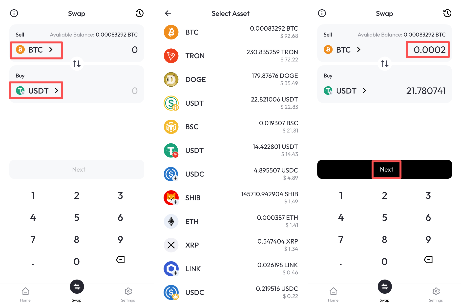 在 Swap 页面,选择卖出和买入的币种,输入需要卖出币种,此时下方会自动显示买入币种的对应金额,点击 “Next” 。
