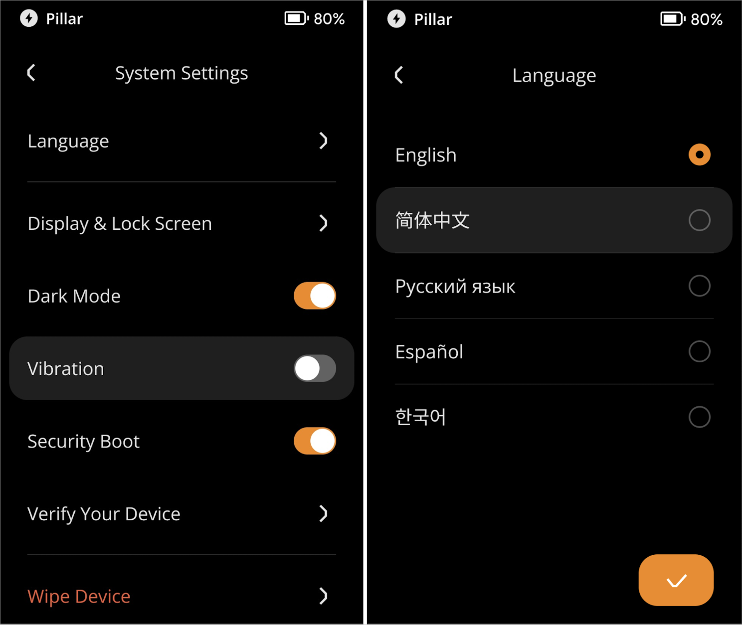 Keystone 3 ProBasic Features多语言本页总览多语言了解如何设置多语言支持的Keystone 3 Pro。确保您的设备安装了1.4.0或更高版本的固件。按照以下步骤初始化您的设备,并轻松切换语言。与Keystone一起探索更多功能!准备工作在开始之前,请确保您具备以下条件:Keystone 3 Pro 运行的固件版本为 1.4.0 或更高场景1:初始化设置阶段开机来到欢迎页面,选择您的语言。场景2:在现有账户上切换其他语言点击主页右上角【…】,进入Device Settings并点击【System Settings】。点击【Language】,选择即可。继续探索Keystone硬件钱包的其他功能吧!