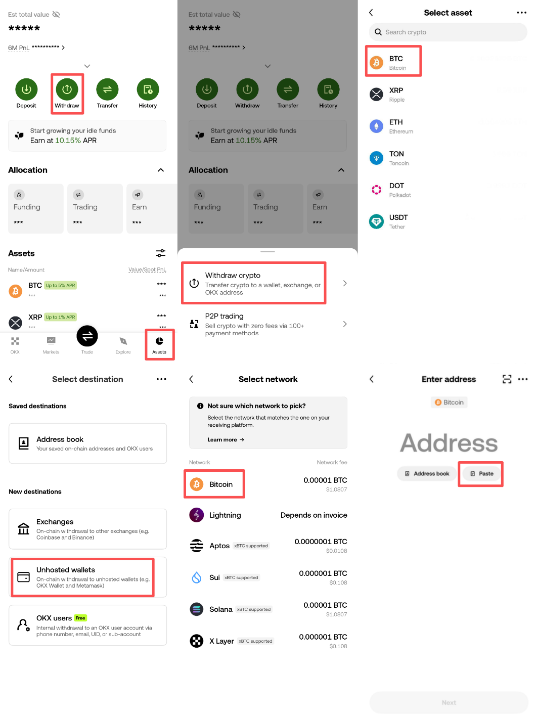 以 OKX 交易所(BTC)为例: 资产页 > 点击[Withdraw] > 选择[Withdraw crypto] > 选择币种[BTC] > 选择[Unhosted wallets] > 选择网络[Bitcon] > 粘贴Nexus上显示的收款地址。