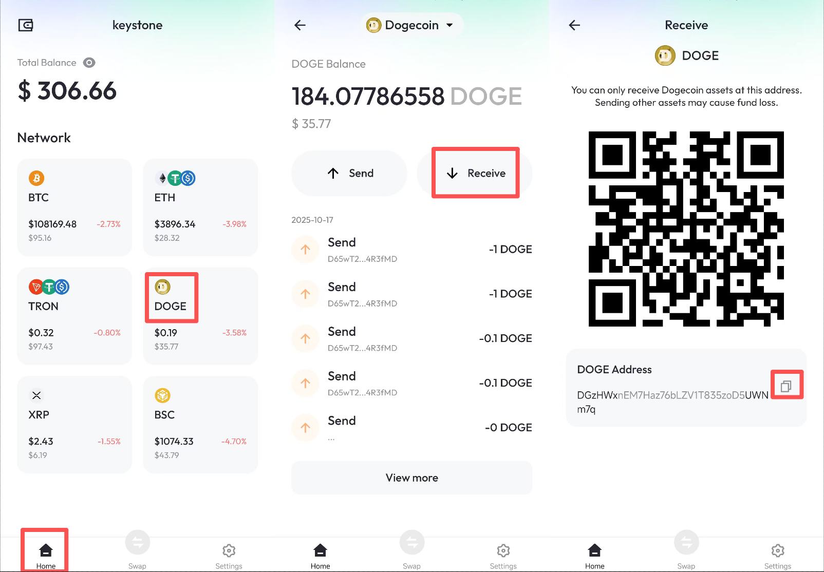 主页 > 选择需要查看地址的币种 > 点击 [Receive];可以查看该的地址的二维码,或者点击下方图标直接复制地址。