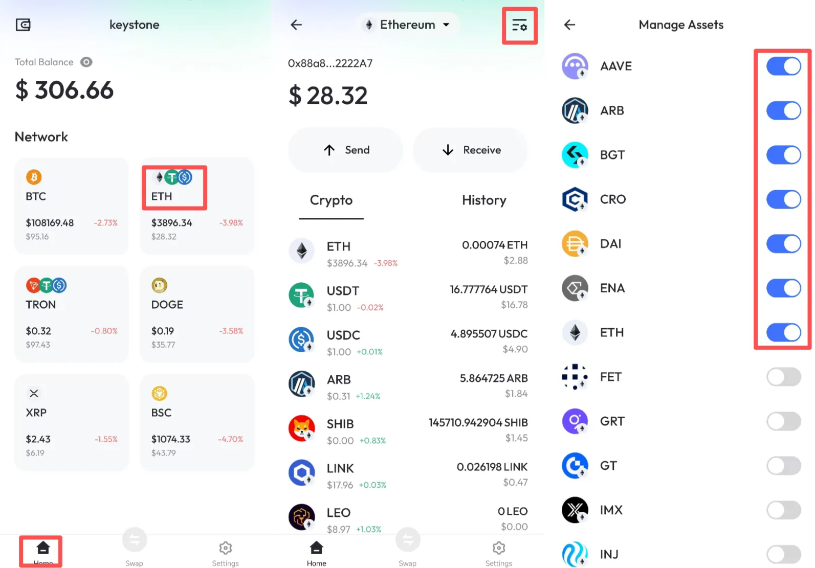 管理在网络上的代币列表(以ETH为例): 主页 > 点击[ETH] > 点击右上角图标 > 选择自己需要展示的代币种类。