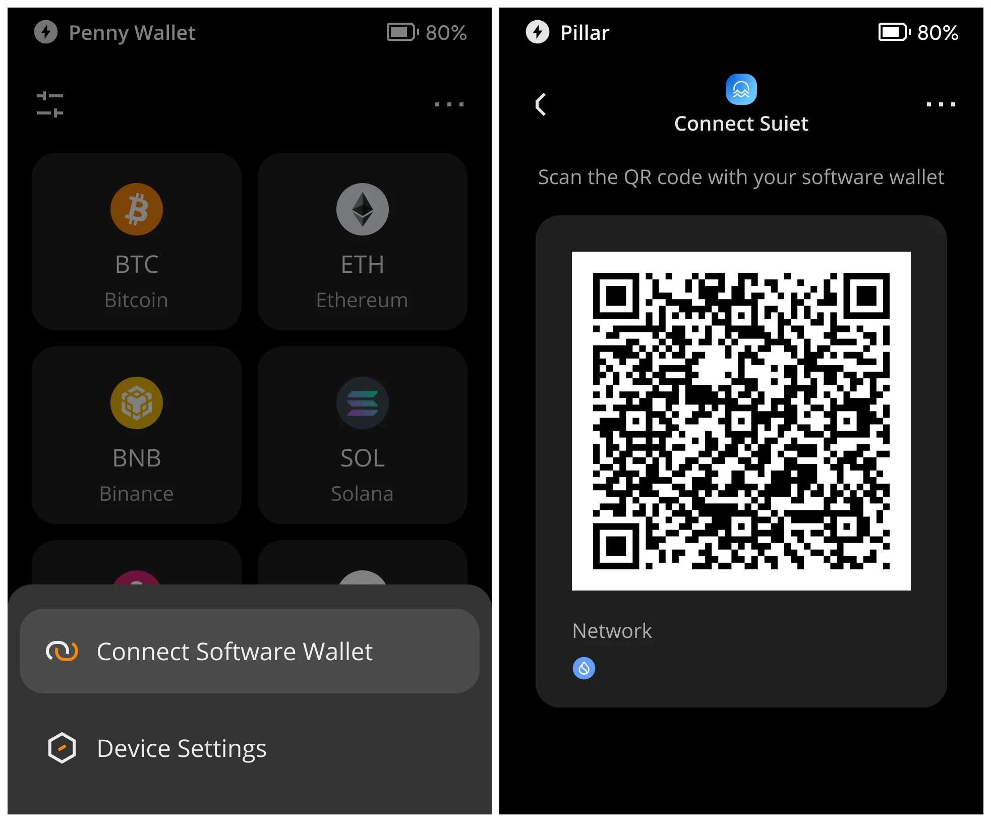 进入 Keystone,点击右上角的【…】,选择【连接软件钱包】,然后在【选择钱包】页面中选择【Suiet】
