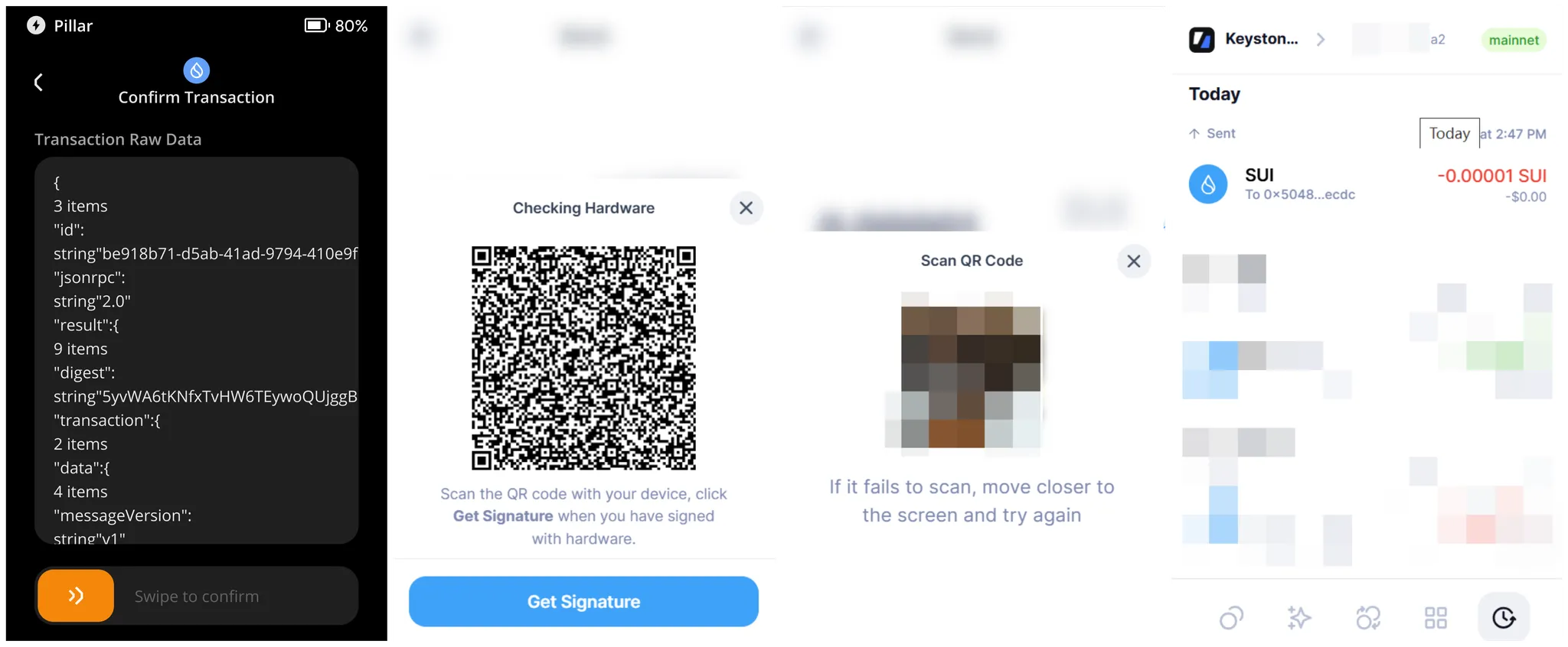 在 Suiet 扩展程序上点击【获取签名】,然后扫描 Keystone 上显示的确认交易二维码以签署交易。