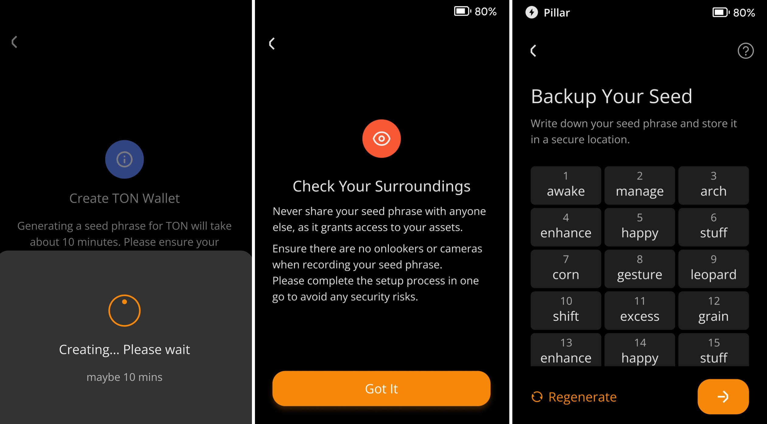 等待设备生成助记词,并私密地备份助记词。确保助记词保存在安全的地方,避免丢失。
