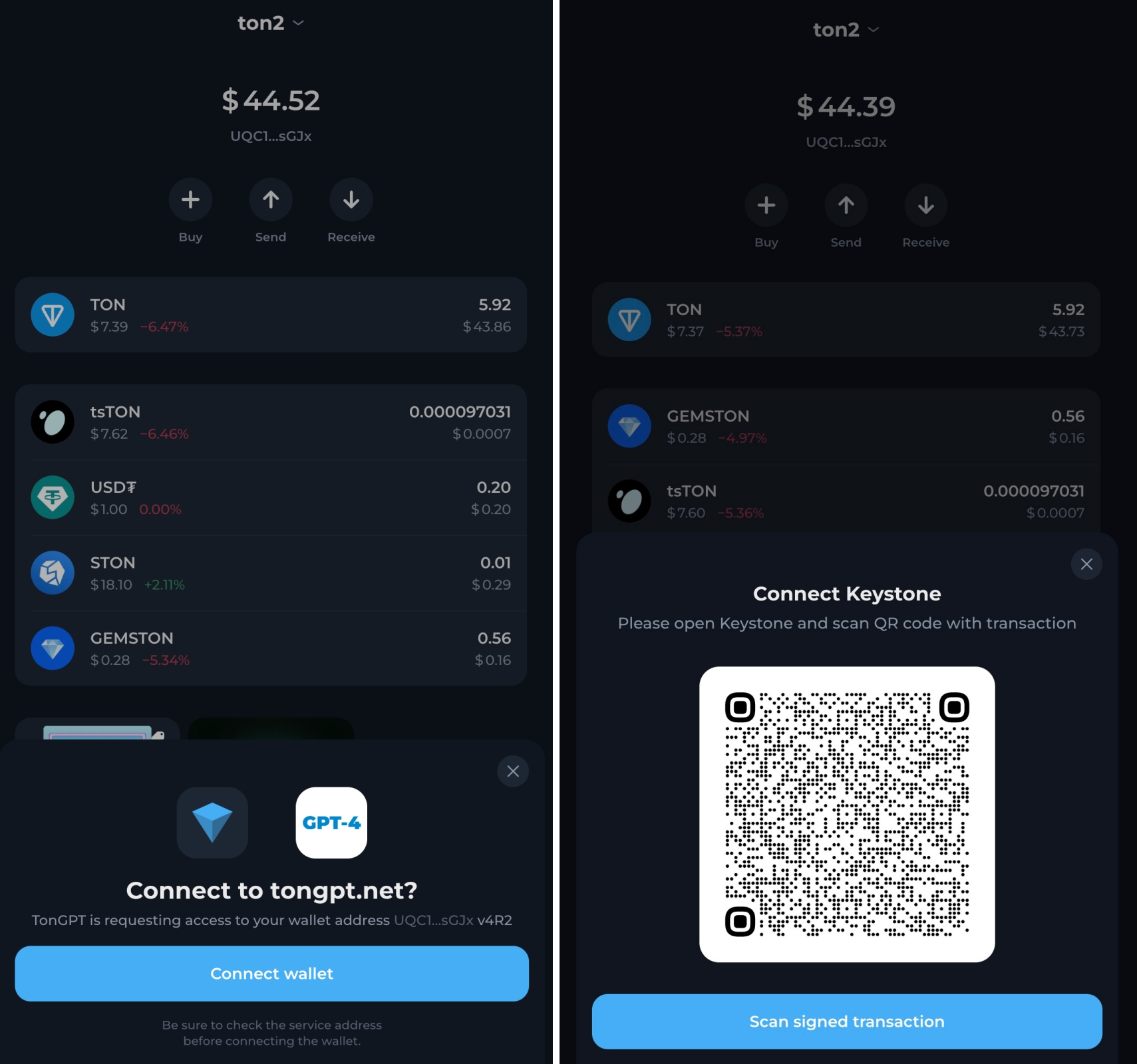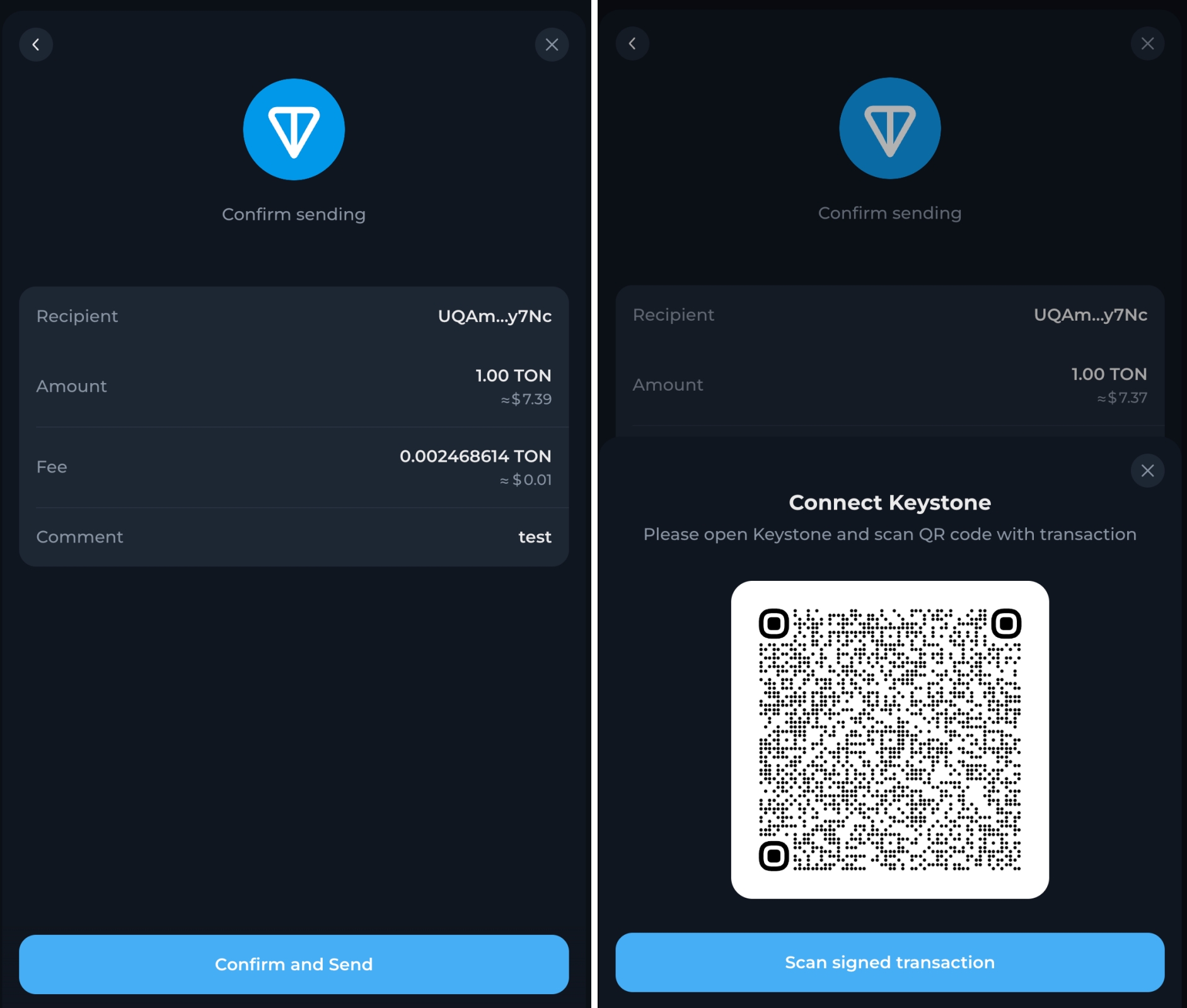 使用 Keystone 设备扫码确认并签名,再使用 Tonkeeper 扫描签名后的二维码即可完成。