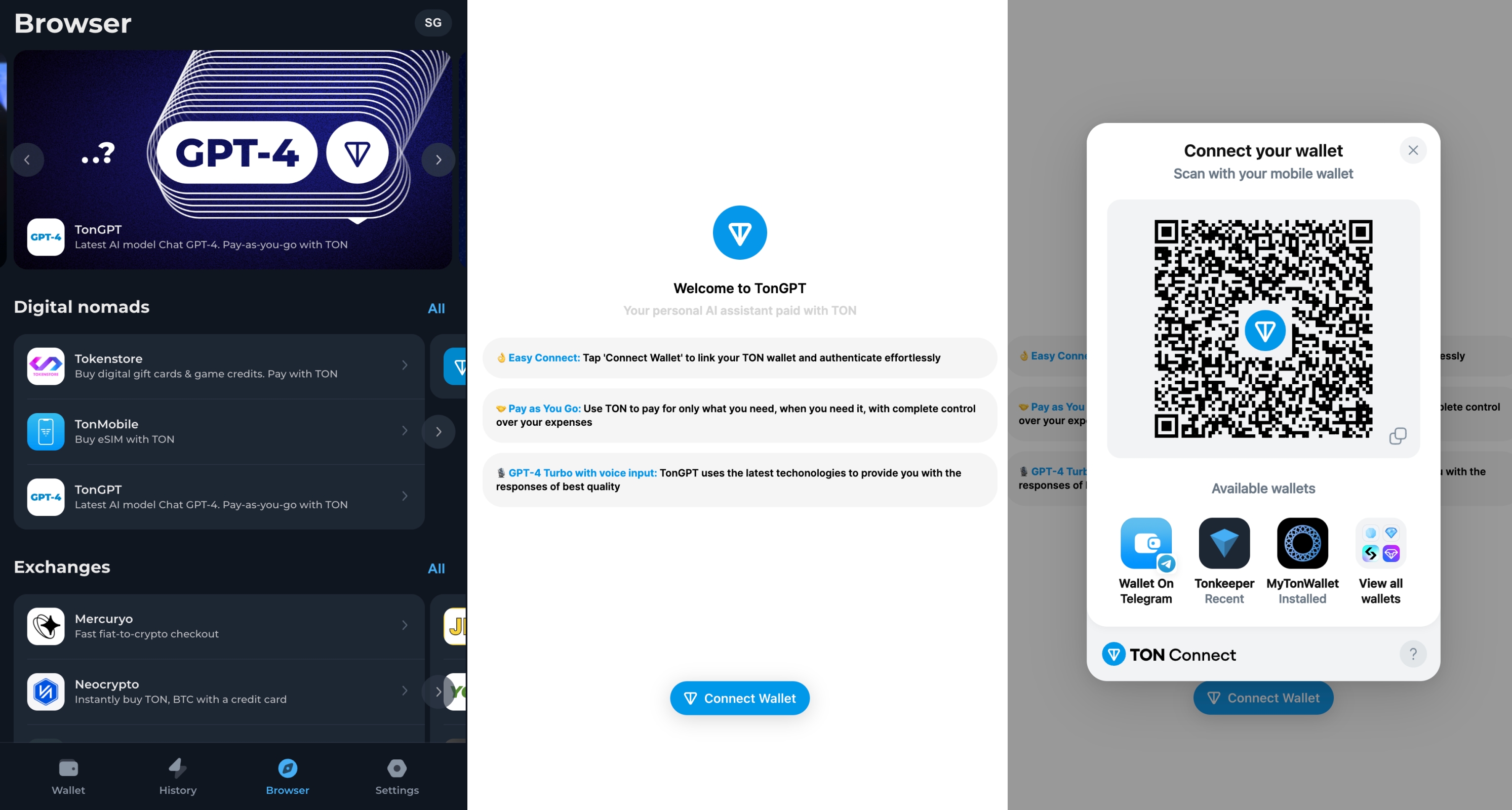 在 Browser 中点击你想选择的 Dapp 图标,点击 Connect Wallet,选择 Tonkeeper 选项。