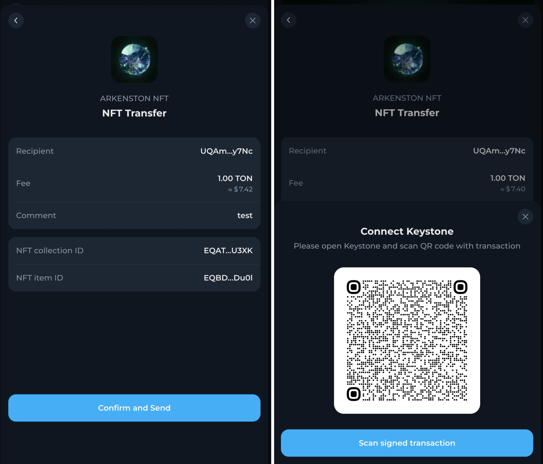 使用 Keystone 设备扫码确认并签名,再使用 Tonkeeper 扫描签名后的二维码。