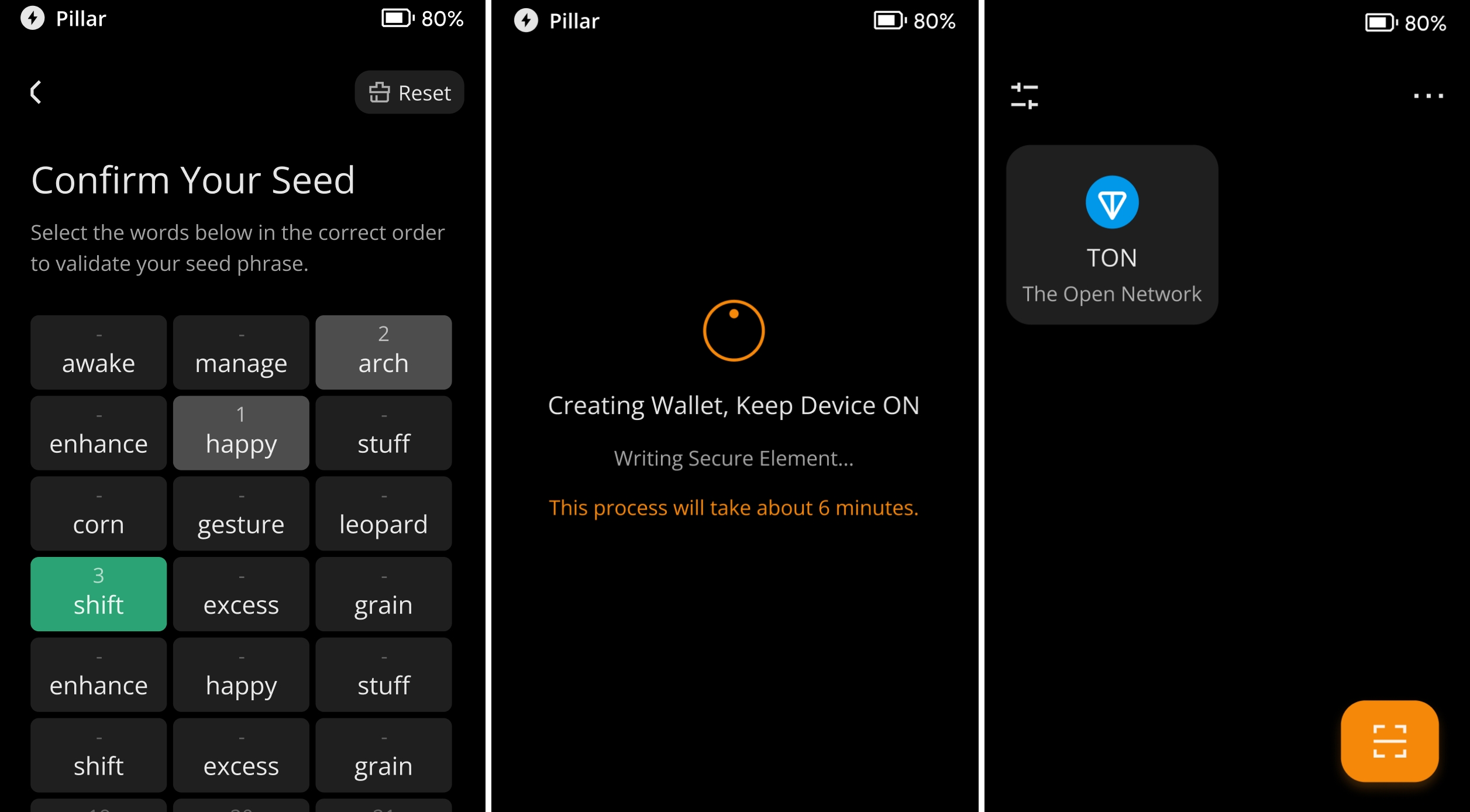 选择右上角“…”,输入 TON 助记词(Tonkeeper 或 MyTonWallet等原生钱包生成的TON助记词),请等待十分钟左右,确保设备有至少60%的电量且接入 USB 充电。