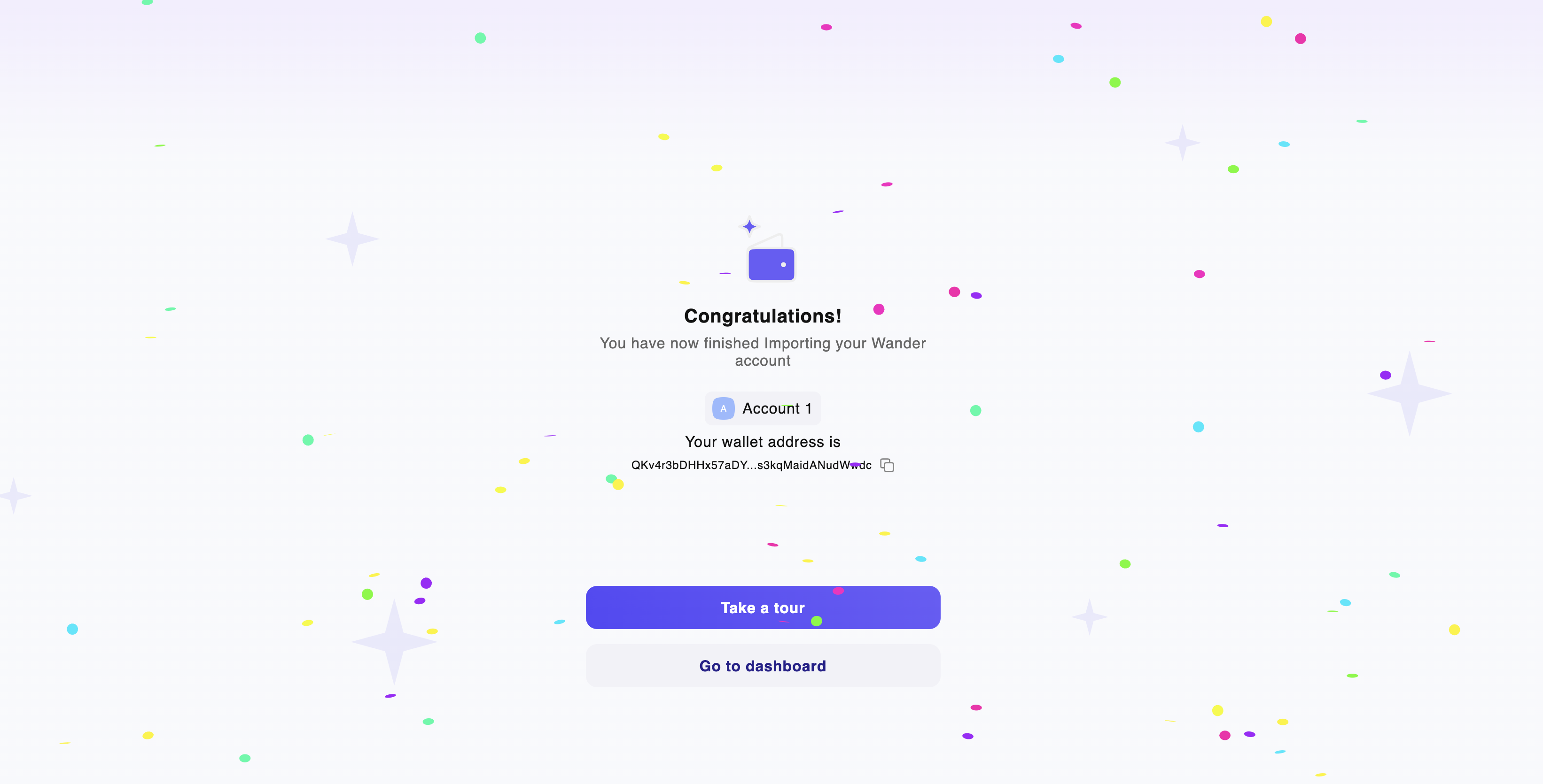 Wander 页面出现 “Congratulations” 的提示时,您的连接就完成了,您可以在该页面点击 “Take a Tour” 探索 Wander 提供的各种功能了。