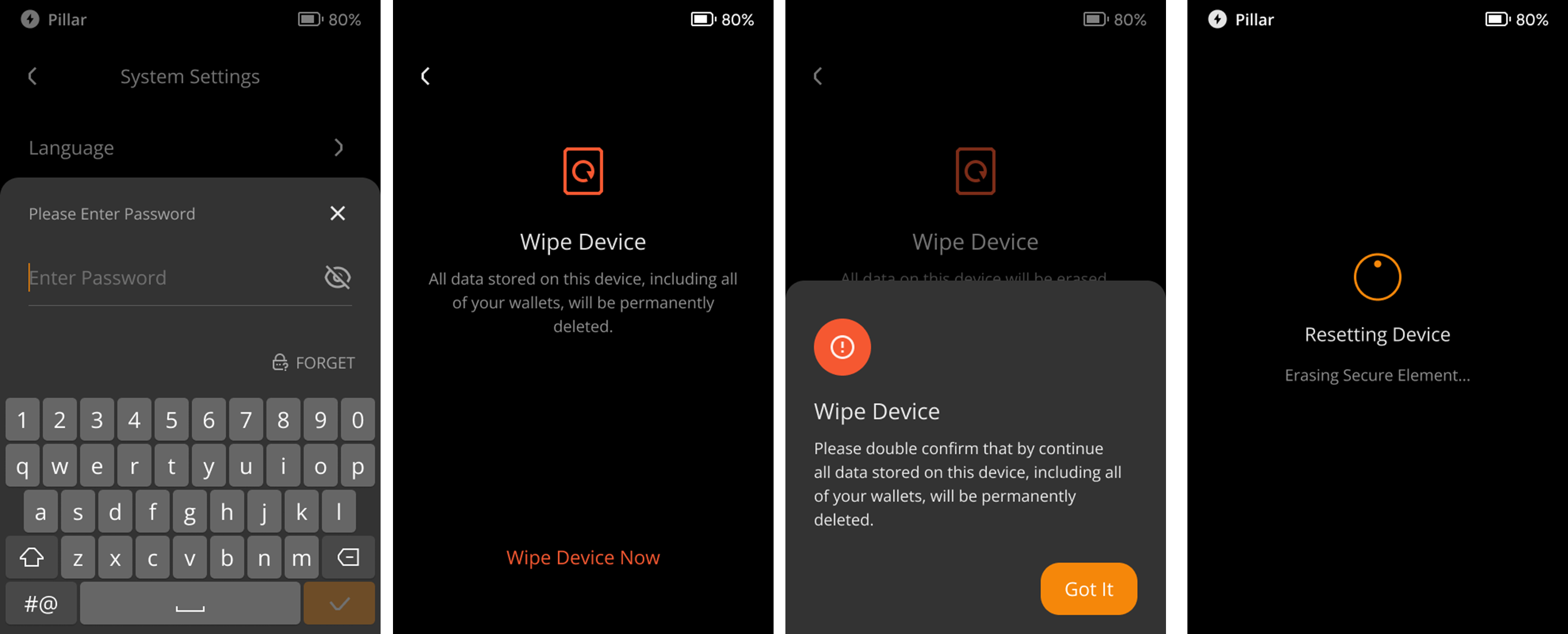 Keystone 3 ProBasic Features恢复出厂设置本页总览恢复出厂设置提示要点总结:您可以根据这篇教程清除数据,恢复出厂设置。恢复出厂设置后,固件版本不会恢复至出厂版本。要恢复出厂设置,设备需要至少有20%的电量。步骤:点击主界面右上角的 [···] > [Device Settings] > [System Settings] > [Wipe Device].输入密码,并按照指示恢复出厂设置。