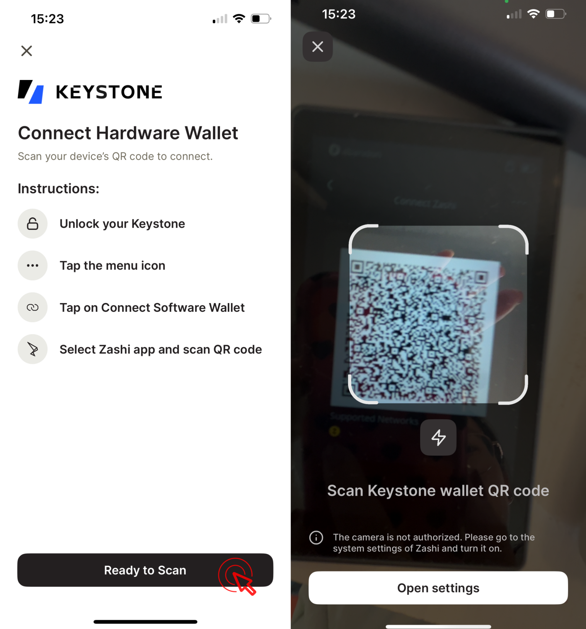 点击 [Ready to Scan],允许 Zashi Wallet 访问摄像头权限并扫描 Keystone 3 Pro 展示的二维码;